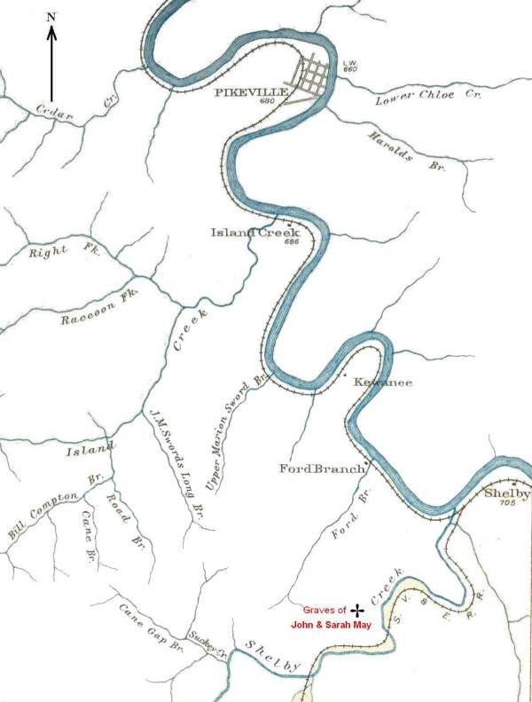 The Sandy Valley & Elkhorn R.R. joins with the Chesapeake & Ohio R.R. at the mouth of Shelby Creek. The C&O was built up the Big Sandy Valley during the first few years of the 1900s and the SV&E RR was built about 1911. The original home of John May (1760-1813) and his wife Sarah Phillips May - their 1800 homestead - was located about 2.2 miles along the creek from the mouth of Shelby. Today this unmarked site is a few hundred yards downstream from the first crossing of the SV&E RR and Shelby Cr. John and Sarah are buried nearby on a hill on the west side of the highway. They settled about 5 miles directly south - as the crow flies - of Pikeville. See photos of the graves. Thomas May (1787-1868) and Dorcas Patton May were married in 1813 and their first few children probably were born at the old May homestead. By the early 1820s they bought a farm on nearby Robinson Creek. They are buried across the road from the present-day Robinson Creek U.S. Post Office. |
