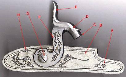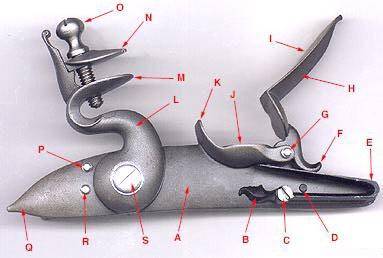 The operator loads the gun, usually from the muzzle end, with black powder followed by shot or a round lead ball, usually wrapped in a paper or cloth patch, all rammed down with a special rod, usually located on the underside of the barrel; A cock or striker tightly holding a shaped bit of flint is rotated to half-cock; The flash pan is primed with a small amount of very finely ground powder, and the flashpan lid is closed; The gun is now in "primed and ready" state, and this is how it would be carried hunting or going into battle. The hammer cannot be dropped from half-cock by just pulling the trigger, but a leather cover is still somtimes placed over the fizzen in case of accidental firing. To fire: The cock or striker is moved from half-cock to full-cock; The gun is aimed and the trigger pulled, releasing the cock or striker holding the flint; The flint strikes the frizzen, a piece of steel on the priming pan lid, opening it and exposing the priming powder; The contact between flint and frizzen produces a spark that is directed into the flashpan; The powder ignites, and the flame passes through a small hole in the barrel (called a vent, or touchhole) that leads to the combustion chamber, igniting the powder there; and The gun discharges.