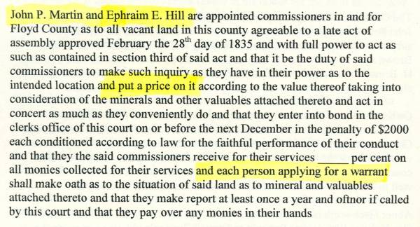 After their marriage in Floyd Co, KY in 1930, four children born there from 1831 to 1835 : John Jefferson, Sareptah, Samuel & Rachel. Ephriam is listed in the 1830 U.S. Census for Floyd Co., KY as head of a household, between 20 and 30 years old, with one female - certainly she must be his bride Elizabeth - between 15 and 20 years old. Between 1831 and 1835 they had four children who were bon in Kentucky: John Jefferson, Sareptah, Samuel & Rachel. The latest record we have of them in the county is in the October 1836 term of the Floyd County Court in which he was appointed as a commissioner for the county regarding the issuing of land warrents for patenting unappropriated land in the county. He served in this role along with John Preston Martin [1811-1862] who later represented the county in the Kentucky State Legislature as a Representative and a Senator and was a U.S. Congressman from Kentucky in the 29th Congress [1845-1847].
