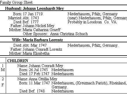 The May brothers and sisters who immigrated to America with their mother in 1748 were members of the sixth generation of the Meÿ family, as identified in The Shoemaker's Children. The descendants of Johann Leonhardt (Leonard) and Frantz (Francis) Peter Meÿ (May) have carried the May name into the Twenty-first Century in America. Leonard's first wife, Maria Barbara Lorentz, apparently died in his hometown of Niederhausen about March 1747, following the birth of their second child.
