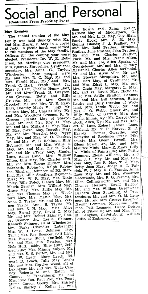 1937 May Family Reunion Return to 1937 Reunion or Index of May Reunions Mr. & Mrs. Daniel E. May Judy, KY, located about four miles north of Mt. Sterling. ![]() |