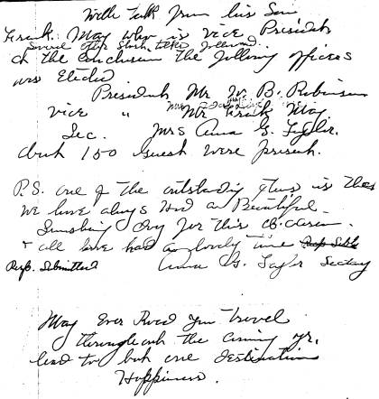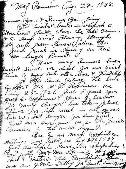 Though this record begins with the date of the 1938 "May" Reunion, it actually includes the minutes of the reunion held in 1937. These minutes begin with the last paragraph of the first page and continue for three more pages. The location and events described in the 1938 minutes are clearly different from the events described in this document. |