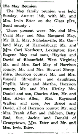Joe Sparks, a grandson of Mamie May Allen and great-grandson of Rev. David L. May, provided information on this reunion. |