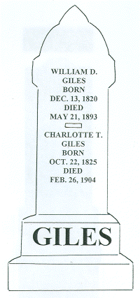 Charlotte Temple May b: 22 Oct 1825 Floyd Co., KY d: 26 Feb 1904 Viroqua, WI, where she is buried beside William in the Asbury Ridge (Methodist) Cemetery .. +William Dudley Giles b: 13 Dec 1820 Lynchburg, VA area m: 7 Mar 1847 Floyd County, KY d: 21 May 1893 Viroqua, WI, buried in the Asbury Ridge (Methodist) Cemetery Willliam and Charlotte are listed in the 1850 Floyd Co, KY census with two children, Thomas and Mary, in the household. They were living in Prestonsburg, where he was a 30 year old carpenter with property worth $600. There are records of William purchasing four parcels of land in Vernon Co., WI in 1855 and another parcel in 1859. The cemetery where he and Charlotte are buried was located by descendants, Don and Sally Giles, and they got the dates of their birth and death dates from the gravestone. Charlotte's death certificate and William's obituary are also in the Giles family files.