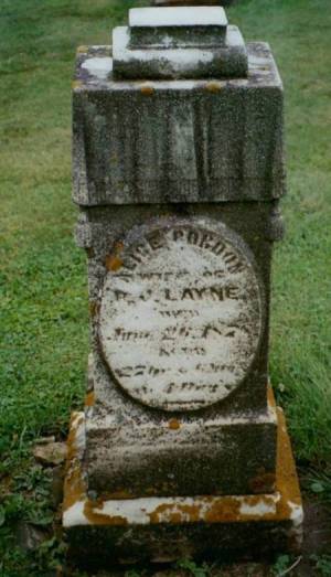 5. Peres Jasper Layne b: 3 May 1844 Prestonsburg, Floyd Co., KY d: 15 Nov 1934 San Diego, CA, buried in Greenwood Cemetery Age at death: 90 ...... +Alice Gordon b: 1851 m: Bef. 1870 Viroqua, Vernon Co., WI d: 1878 Vernon Co., WI, buried in Viroqua Cemetery Age at death: 27 est.