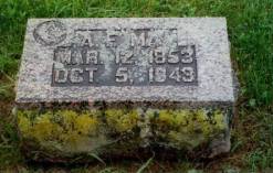 7. Samuel M. May b: 14 Feb 1848 Pike Co., KY d: 30 Sep 1848 Pike Co., KY Age at death: 0 8. James May b: Abt. Jan 1849 Pike Co., KY d: Bef. 1860 Clay Co., KY Age at death: 11 est. 9. Isabella (Belle) Virginia May b: 28 Sep 1849 Clay Co., KY d: 9 Mar 1875 Viroqua, WI, buried in the Springville Cemetery Age at death: 25 10. Robert Daniel May b: 25 Aug 1851 Clay Co., KY d: 24 Nov 1942 Pomona, CA Age at death: 91 ...... +Ellen Jane Lawrence b: 8 Dec 1861 Crawford Co., near DeSoto, WI m: 21 Aug 1889 Crawford Co., near DeSoto, WI 11. Alonzo Franklin May b: 12 Mar 1853 Clay Co., KY d: 5 Oct 1943 Viroqua, WI, in family cemetery. Age at death: 90 ...... +Eva Eckhart b: 17 Nov 1851 Alsace, Germany m: 29 May 1883 Vernon Co., WI d: 17 May 1930 Viroqua, WI, in family cemetery. Age at death: 78