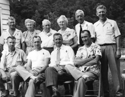 picture was taken at a family reunion that was held in 1953 Back row L-R: Charles Milton Picklesimer, Mable Picklesimer, Edward Jackson Picklesimer, Sr., Polly Anna Marrs Picklesimer, Irvin Marrs Picklesimer, Marland Dent Picklesimer. Front Row L-R: Edward Jackson Picklesimer, Jr., Clancy Ernest Picklesimer, Sr., Samuel Marvin Picklesimer and Billie Eugene Picklesimer. Billie Eugene legally changed his name to William Michael Picklesimer. Courtesy of John Walter Picklesimer, Sr., a grendson of E.J. & Polly Marrs Picklesimer.