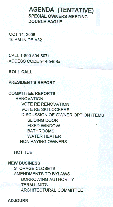 be held in Breckenridge on Saturday, October 14, 2006 Arrangements have been made for this to be a telephonic meeting. If you can't attend the meeting in person please call 1-800-504-8071 a few minutes before the scheduled time and enter the access code: 944-5403 followed by the # sign