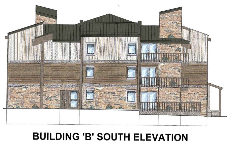 View from the entrance from Four O'Clock Road. The siding materials would be the same in either roof design.
