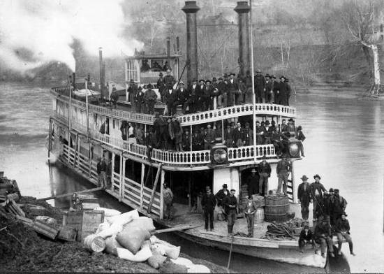 Taken around 1891, this photo shows the steamboat Cando moored at the Prestonsburg dock. Built for the C and O Railroad, it acquired its name after the man painting the sign on the pilot house forgot to leave spaces between the letters. Visible in the foreground are boxes, casks and bags containing sugar, flour, coffee, lead, gunpowder, horseshoes, and other supplies. Boats like this one ascended the river during the rainy season, when water levels were high. This magnificent photograph was once the property of James Hatcher of Pikeville. It was saved for posterity by Henry Scalf, and today it is part of the Scalf Collection in the Alice Lloyd College Photo Archives. |