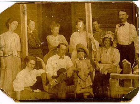 Taken around 1910, this photo shows Nelle Davidson May, widow of A. J. May, posing with Prestonsburg relatives and friends. Nelle is the woman in the bonnet. The boy in the straw hat is Colonel May, her son by Colonel Andrew Jackson May. The woman kneeling on the left is Victoria Arnold, Nelle`s sister. The man in the wicker chair is Edward Arnold, Victoria`s husband, who owned and operated a funeral home. Tom Burchett, standing on the right, owned the town`s livery stable. The lady standing directly behind Mr. Arnold is Winifred Johns, the wife of Thomas Johns, grandson of early Prestonsburg merchant John Johns. Until it burned in 1987, the Johns House on Front Street was a familiar Prestonsburg landmark. |