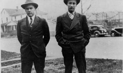 This photo shows William May and E. B. May, Jr. standing in front of their Grandma Barney`s house in Ashland, Kentucky. With their double-breasted suits and Fedora hats, they look like they could hold their own with John Dillinger. In 1942 Bill joined the U. S. Army and saw action in Europe, serving with the 125th AAA Battalion. His unit was under fire during the Battle of the Bulge. E. B. served with the U. S. Marines in the South Pacific and saw action at Iwo Jima. After the war, Bill and E. B. returned to Floyd County and entered civilian life. Bill learned sign-painting and took a job with the Russell May Sign Company. E. B. became manager of the shoe department in the Francis Department Store. |