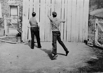 Taken in the mid-1930s, shortly after they returned to Prestonsburg, this photo shows Bill May and Junior May playing basketball next to the May House smokehouse. The smokehouse was located directly south of the one-story ell. The smokehouse was probably forty or fifty years old when this photograph was taken. In the early period, it may have served as a free-standing kitchen for the main house. Other structures also adjoined the house in the early days. According to E. B. May, Jr., a one-story barn was situated on the land now occupied by his present home. The barn contained a fattening pen for hogs and was adjoined by a hog lot. Hogs were Floyd County`s main cash crop in the antebellum period. |