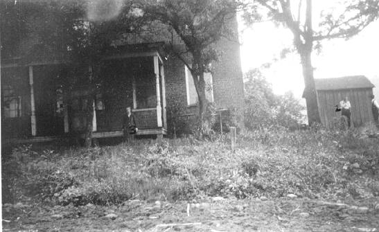 Found in Tress May Francis`s May Family Album, this photo shows the smokehouse that used to stand immediately south of the one-story section of the house. The man on the far right is Beverly Clark May. The man next to Beverly is Frank Morgan. The woman standing in front of the house is Tress May Francis, daughter of Beverly May. Frank Morgan was evidently renting the May House when the photo was taken. During the 1920s several tenants rented the May Farm and lived in the house. Bill and Junior May, the last owners of the house, say that during the 1920s, one of these tenants ripped up the flooring in the attic and burned it for firewood. He also burned a spinning wheel and several other priceless family heirlooms. |