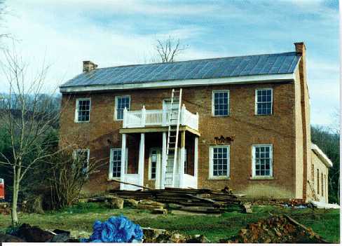 This photo shows the front facade of the May House in January, 1997. The porch has just been completed and is in the process of being painted. Old floor boards have been piled in front of the house. During the period when his crew was restoring the house, Jack Kauble and his wife Susie lived in a trailer on Riverside Drive in Prestonsburg. Barry and Miller stayed with them during the week and commuted to Ohio on the weekends. The old oak floor beams which were removed from the downstairs part of the house are now in the possession of Terry Ratliff, the well-known Floyd County chair-maker and woodcraftsman. |