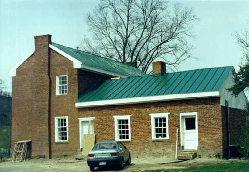 This photo shows the south facade of the house and the one-story `ell,` containing the dining room and food-preparation room. During the restoration process, the ell was completely demolished and rebuilt from the ground up. The ceiling beams of the original ell were saved, along with the interior brick wall, the fireplace and chimney, and some of the woodwork. Bricks recovered from the demolition were used in the new walls. The walls of the new ell are composed of cement blocks faced with the bricks recovered from the original ell. A new cement foundation was laid along both the north and the south walls. |