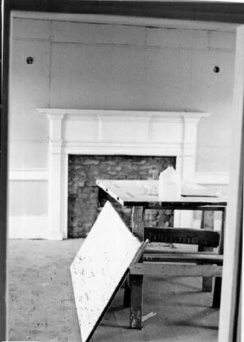 This photo shows the upstairs south bedroom shortly after the installation of the drywall. Saw horses are being used to support a door that is being restored. Master Carpenter Ben Barry crafted several new doors for the house during the course of the restoration. One of these is the door on the south wall of the dining room. Except for the front door of the house, which retained its original lock and key, all the doors of the house were fitted with new locks. Since the restoration an electronic security system has been installed. |