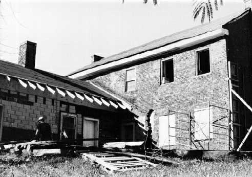 This photo shows the how the rear of the house looked in November, 1996. During this period, the one-story `ell` of the house was demolished and rebuilt, brick by brick. Bricks salvaged from the demolition were used again. The exterior walls on both sides of the ell were demolished and new walls were erected. The ceiling beams of the original structure were saved, as well as the interior brick wall, fireplace, and chimney. Also demolished were the interior floors and floor beams. Much of the interior woodwork, including a large walnut cupboard, was saved. The exterior walls of the new ell are composed of bricks saved from the original ell. |