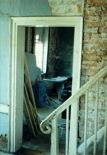 This photo shows the condition of the interior brick walls before they were parged with cement. As you can see, the mortar in these walls was dry and crumbling. Something had to be done, so Jack Kauble decided to parge the walls. I would like to emphasize that Contractor Kauble performed this work notwithstanding the fact that it wasn`t included in the original contract. In this and other instances, Kauble proved that he was a man dedicated to his work. The walls were too badly deteriorated for drywall to be mounted against them, so Kauble decided to install two-by-four studs, laying them flat against the wall to conserve space. This work also wasn`t budgeted. |