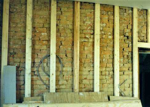 This photo shows a portion of the east wall of the north upstairs bedroom before it was plastered with concrete--a technique called `parging.` The two-by-fours provided a mount for the drywall. When the workmen removed the old plaster from the interior walls, they discovered that the mortar was dry and crumbling. To remedy this, Jack Kauble decided to `parge` the interior walls. This work wasn`t in the contract. The expense involved in purchasing and installing the two-by-fours also wasn`t in the contract. That Kauble decided to do this work despite the fact that it wasn`t budgeted testifies to his integrity and dedication to his work. |