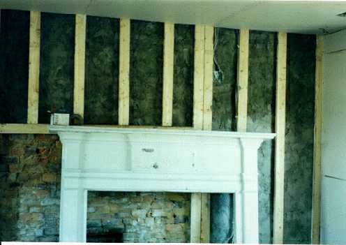 This photo shows the north wall of the upstairs north bedroom just after it was parged. The two-by -four studs, which have been laid flat against the wall, will serve as anchors for the drywall. They have been attached to floor and ceiling beams. Also visible in the photo is a switchbox. During the restoration the house was completely rewired for electricity. Heating and and air-conditioning systems were also installed. The mantel shown here is one of five hand-carved mantels in the house. They were probably purchased from craftsmen in Louisville or Cincinnati and shipped up the river on a flatboat. |