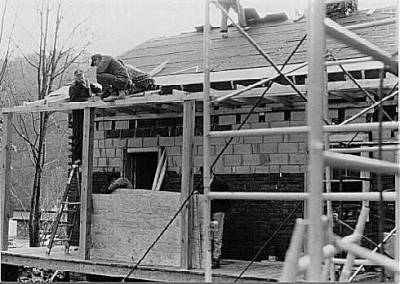 is still partly visible. In September and October, 1996, the original ell was demolished. The old porch was removed, and the walls of the structure were torn down brick by brick. The end wall of the ell was saved, as was the interior wall with its fireplace. Also saved were the ceiling beams, the doorsills and window casings, and a walnut linen cabinet in the dining room. The dining room is the room in the ell immediately adjacent to the main house. |