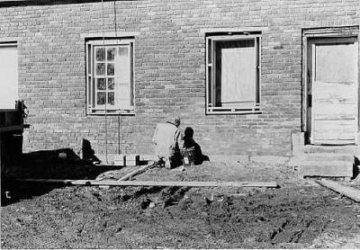 This photograph, taken sometime in the Fall of 1996, shows John Miller working on the new south wall of the ell. When these bricks were laid, room was left in the cracks between the bricks so that they could recieve a second layer of mortar. After the first layer of mortar had dried, John Miller applied a second layer of mortar to the wall. After it cured, the second layer matched the mortar being used to tuckpoint the walls of the main house. |