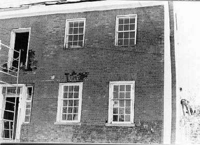 This photo shows the front facade of the house as it was in October, 1996, when John Miller was tuckpointing the bricks of the front facade. The work consisted of three stages. First, the wall was cleaned with a steam cleaner, a process which removed the accumulated grime of 180 years. Second, all the loose or discolored mortar was removed. Finally, new mortar was applied wherever it was needed. Much care was taken to insure that the new mortar matched the mortar which was already in place. Tuckpointing is delicate and painstaking work, and Floyd County owes a debt of gratitude to John Miller for his fine job. |
