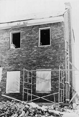 This photo shows the new east wall of the house. In August, 1996, a large part of the original east wall was demolished and a new cement-block wall was erected in its place. The new wall was completed in October, 1996. The wall was erected on a poured cement footing. After the cement blocks were in place, they were faced with a wall of bricks recovered from the original wall. Much of this work was done by Jack Kauble, foreman of the project. Extreme care was taken to make sure that the new brick wall fit seamlessly into the old brick wall. Completion of this wall stablized the main house and served as the cornerstone of the restoration process. |