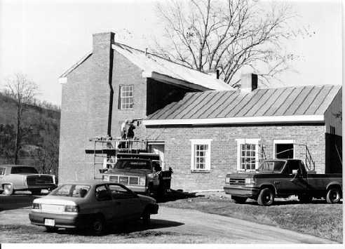 This photo shows the ell of the house in February, 1997, shortly after the new roof was installed. The customized, standing-seam steel roof was manufactured on the site with a cast-steel bending and cutting machine.