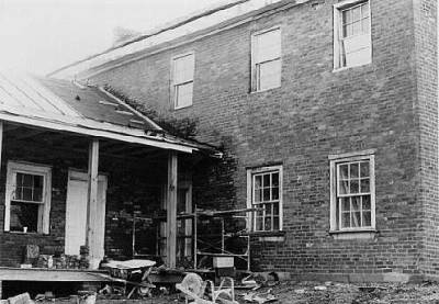 This photo shows the rear of the house as it appeared in December, 1996, when the roof of the newly-constructed ell was nearing completion. At that point parts of the east wall of the main house still hadn`t been steam-cleaned. The May House roof is a custom-cut standing-seam steel roof. Rolls of sheet steel were hauled to the site and cut on a cast-steel cutting machine. The roof of the ell was constructed by Jack Kauble and local craftsman Brent McCormick. By the way, Brent McCormick is the son of Joy James, wife of Fred James, Sr. and member in good standing of the Friends of the Samuel May House. |