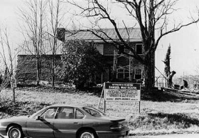 being restored. Visible in profile on the right side of the house is the stump of a huge pine tree. For a picture of this tree when it was still alive, see `May House, 1936,` a photograph in the May Family Album. The May House faces the Big Sandy River. The rear of the house faces U.S. Route 23/460, one of the main arteries running through North Prestonsburg. The house stands opposite Pizza Hut and Wendy`s Restaurant. |
