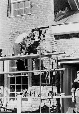 This photograph, taken in March, 1997, shows John Miller of Olentangy Restoration rebuilding the south wall of the main house. The original wall bulged at this point, so the bulging portion had to be removed and a new wall constructed. This was delicate work, and John took every precaution to make sure that it was done right. One false move and the whole south wall of the house could have collapsed. |