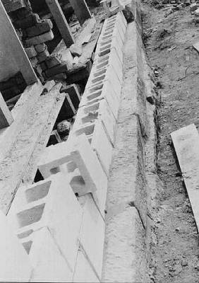 Taken in October, 1996, this photo shows the new foundation of the south wall of the ell. The walls of the new ell are composed of cement blocks faced with bricks recovered from the demolition of the old ell.