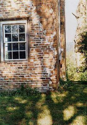 Taken in the Fall of 1995, this photo shows the east wall of the main house as it was before the restoration began. The crack visible in this photo was the focus of much worry and concern during the months leading up to the restoration. The wall in this photograph is not the original wall. The original wall collapsed back in the 1970s, during the blasting that accompanied the building of U.S. Highway 23, which runs directly behind the house. The darker bricks are the portion of the original wall that was saved. When the original wall collapsed, a new cement-block wall was erected in order to keep the rest of the house from falling. Unfortunately, it didn`t solve the problem. |