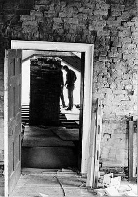 Taken in December, 1996, this photo shows the doorway to the attic. The plaster on the wall around the doorway has just been removed, exposing the brick wall underneath. Kim Goodwin and Rick Middleton are in the far end of the attic. The walls of the May House are four bricks thick. When the plaster was removed from them, as this photo shows, the mortar was found to be loose and crumbling. Something had to be done to firm up the walls. To remedy this problem, Kauble decided to parge the walls. In other words, a layer of cement was laid on them with a trowel. Then two-by-four studs were laid against them in order to provide an anchor for the drywall. |