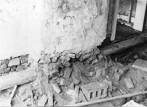 This photo shows the bad condition of the foundation of the interior brick wall of the ell. It was taken in October, 1996, when the original ell was being demolished. This is the west wall of the food preparation room. The chimney visible here serves the dining room fireplace. In the old days it probably also served a fireplace in this room. When Ben Barry started repairing this structure, part of it collapsed and released a huge cloud of soot. Being enveloped by a cloud of 180-year-old soot is not a pleasant experience. Just ask Ben Barry. |