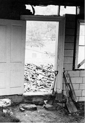 Taken during the construction of the new ell, this photo shows the dining room doorway to the north porch. The flooring and floor beams of the dining room have been removed, showing the ground underneath. Before the restoration began, we entertained hopes that something of value might be discovered under the floors. Visions of gold pieces danced in our heads. Unfortunately, little was found except for a few old bottles. Right now the bottles are in the possession of Professor Perry. At the appropriate time they will be placed on display. |