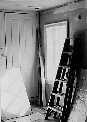 This photo shows the walnut cabinet on the south side of the dining room fireplace. During the restoration, it was detached from the wall and laid face downward in the center of the room. After the wall was repaired, it was re-attached. The cabinet is solid walnut and its shelves show the marks of the circular saw. In other words, they were fashioned at a local saw-mill. In the old days it probably held Catherine May`s dishes and linen tablecloths. |