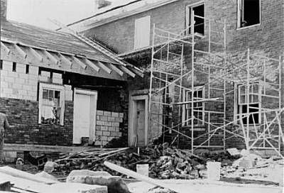 Taken in December, 1996, this photo shows the new ell as it was nearing completion. Kauble`s crew has finished constructing the piers for the back porch, and the porch floor beams have been mounted on them.