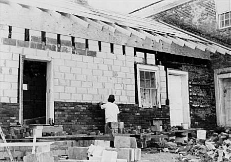 Taken in December, 1996, this photo shows Joe Elswick laying the brick face of the north wall of the ell. The original brick wall on the right side of the dining room door is being demolished brick by brick.