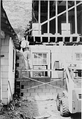 Taken in September of 1996, this photo shows Jack Kauble laying the new cement-block wall on the north half of the east wall of the main house. Demolishing and rebuilding this wall was the first phase of the May House restoration. It was necessary to stabilize the outer walls of the main house before undertaking the demolition of the ell. In other words, rebuilding the north half of the east wall was the key to the success of the entire project. |