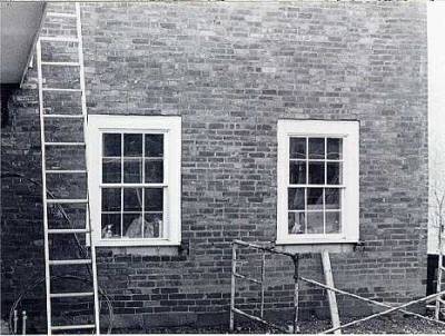 This photo shows the east wall as it looked in March, 1997, just as the restoration was nearing completion. Note that the sandstone windowsills have not yet been put in place.
