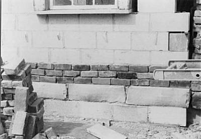 This photo shows the cement-block wall that was erected after the original wall of the ell was demolished. A new foundation was laid on new cement footers. Bricks recovered from the old wall were used to create a brick face for the new wall.