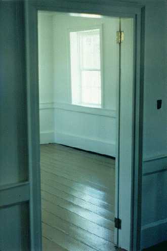 This photo shows the floor of the south upstairs bedroom. All the floors of the upstairs portion of the house are original. Workmen cleaned them thoroughly, and then they were painted antelope brown. We think that the south bedroom of the house was used by Samuel`s and Catherine`s eight daughters. The younger children of both sexes probably slept in the large attic adjoining the south bedroom. Tress May Francis has preserved the tradition that Catherine May was very proud of her daughters, and that when the eight of them would set out for church on Sunday, `dressed in their finery,` they were a sight to behold. |