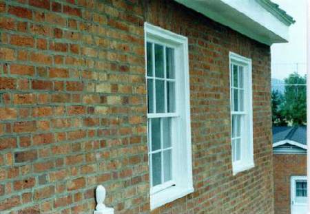 This photo shows the texture of the front facade of the house. The bricks were manufactured on the site, using clay from a pit that was located immediately south of Wendy`s Restaurant. The bricks are extremely hard, and the color irregularities of individual bricks add to the overall effect. Some bricks are pink, some are orange-red, and some are dark red, creating a charming mixture of tints and hues. |