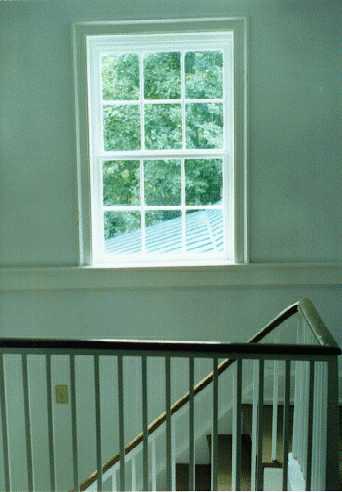 This photo shows the window on the upstairs landing of the house. The hand-rail and other parts of the staircase are hand-made and were manufactured on the site. The house sports a standing-seam steel roof. The wall separating the landing from the north bedroom was erected by the second owner of the house. In Samuel May`s time, the north bedroom extended from the north wall of the house to the south wall of the landing. Family tradition says that this `ballroom` was the scene of many dances and parties. Samuel`s sons and daughters were a fun-loving group, and we can imagine them dancing the Virginia Reel to the tune of a fiddler standing in the corner. |
